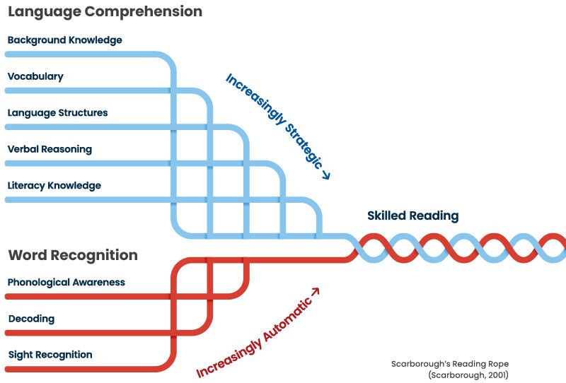 Regardless of age, students who need to build or solidify a strong reading foundation must be instructed in alignment with the science of reading. Structured Literacy approaches, grounded in this science, have proven effective for readers of all ages, including those with learning challenges like dyslexia. Structured Literacy emphasizes skill development across the domains of word recognition and language comprehension, as illustrated by Scarborough’s Reading Rope (Scarborough, 2001). Structured Literacy not only focuses on providing explicit, systematic, cumulative instruction in the structures of language, it also integrates the five pillars of reading instruction identified by the National Reading Panel (2000): phonemic awareness, phonics, fluency, vocabulary, and comprehension.