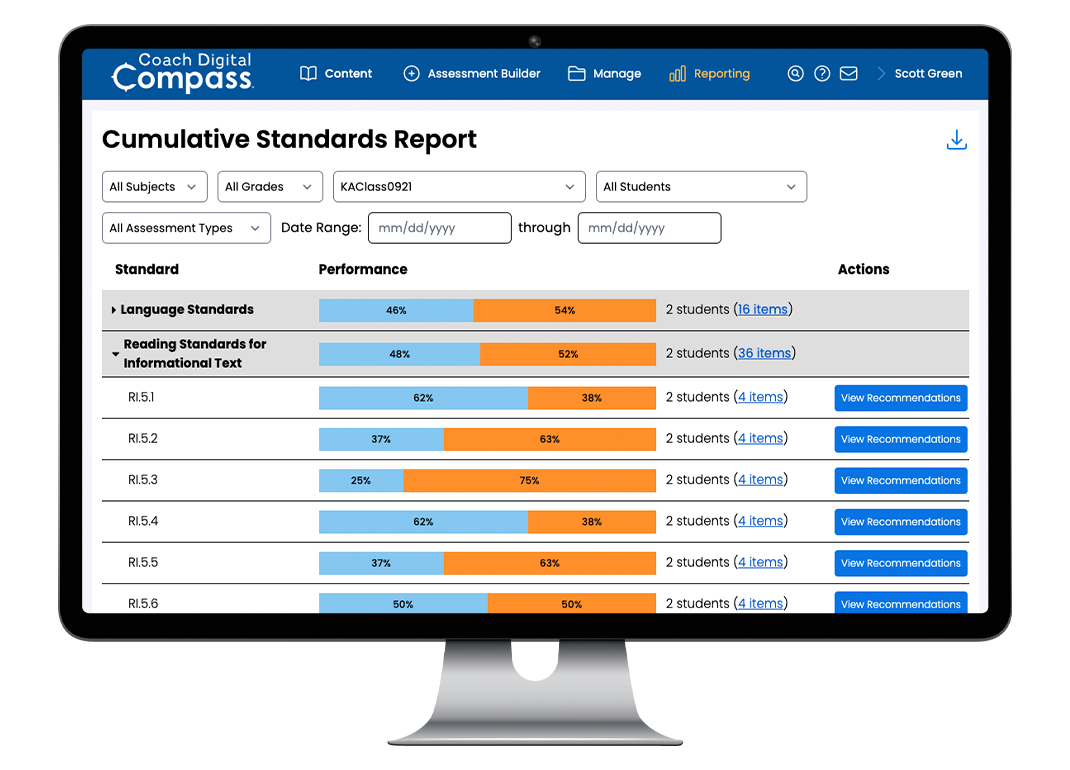 Creating an assessment is easier than ever. With more than 6,400 questions, the Coach Digital Compass Enhanced Assessment Builder offers the power and flexibility to build custom assignments and assessments that meet your classroom needs. Based on student assessment scores, actionable reports continuously inform instruction, recommending Library resources for additional practice and remediation as needed: