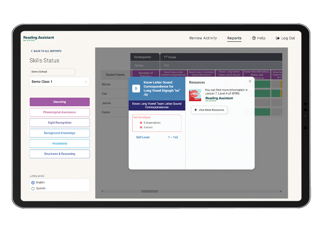Progress monitoring and comprehensive reporting from every reading practice session with reports in English and Spanish.