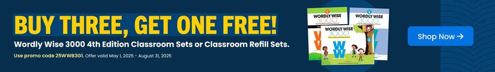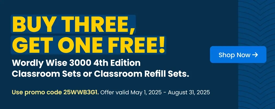 SPECIAL OFFER DETAILS: Classroom Sets and Classroom Refill Sets do not have to be the same level. There is no limit to the number of Classroom Sets or Classroom Refill Sets that can be purchased and redeemed with this offer. Free Set must be of equal or lesser value. Special Offer is for the Wordly Wise 4th Edition print program only and cannot be combined with any other offers or applied to previous orders. Shipping fees applied prior to promotion and apply to all sent items. Distributors and accounts outside the US are not eligible for this promotion. Must use promo code 25WWB3G1. Offer expires 8/31/25.
